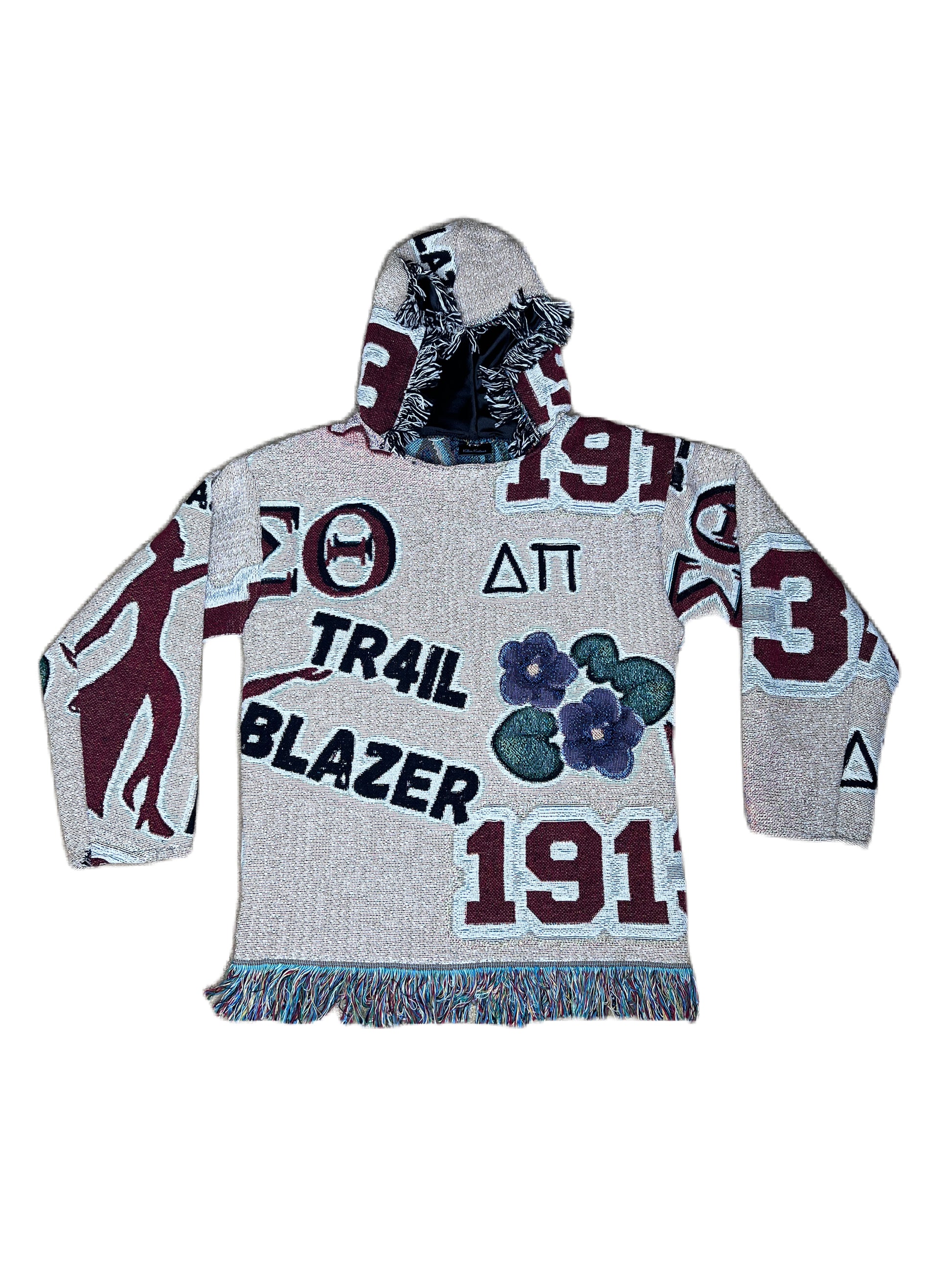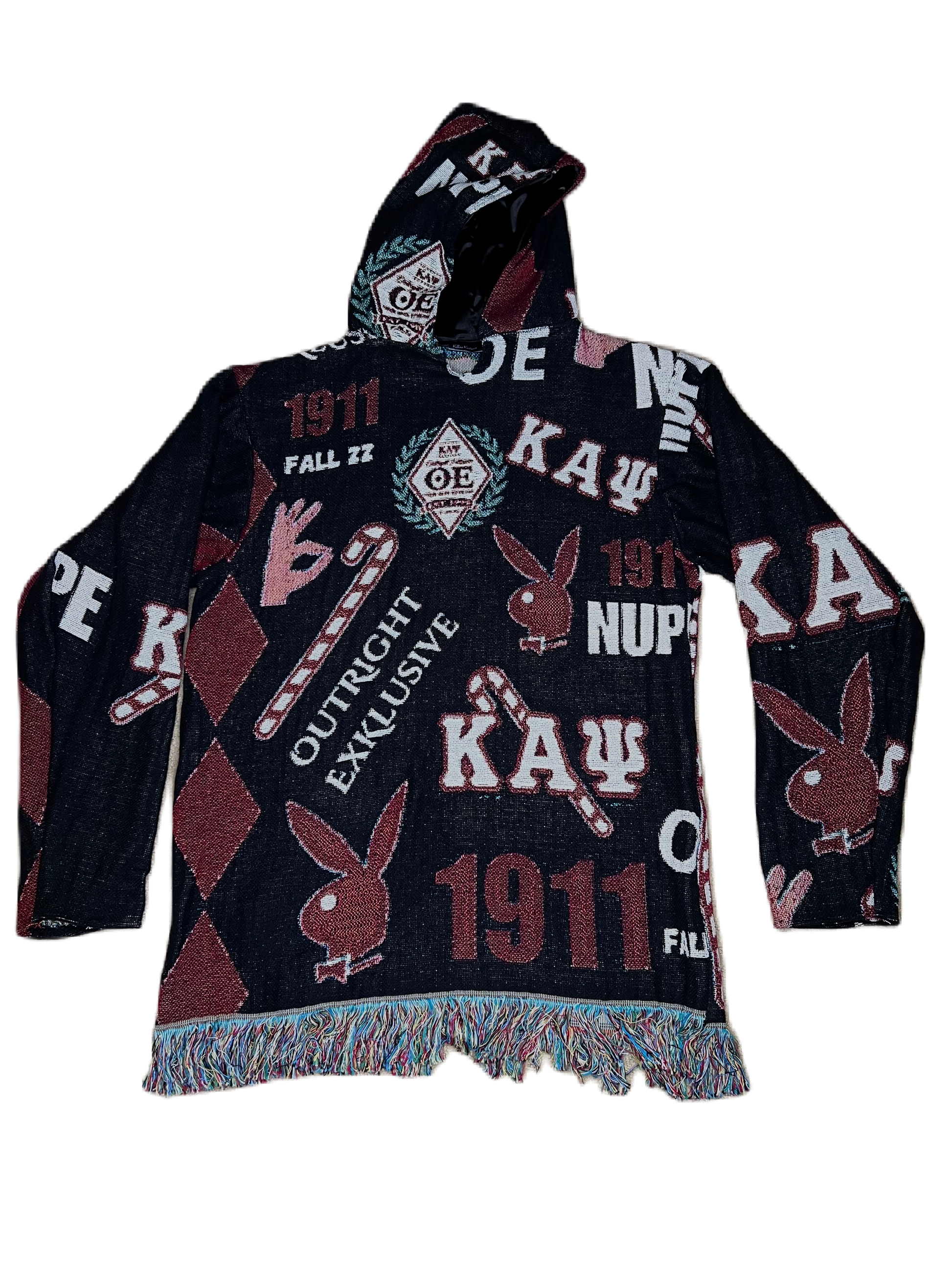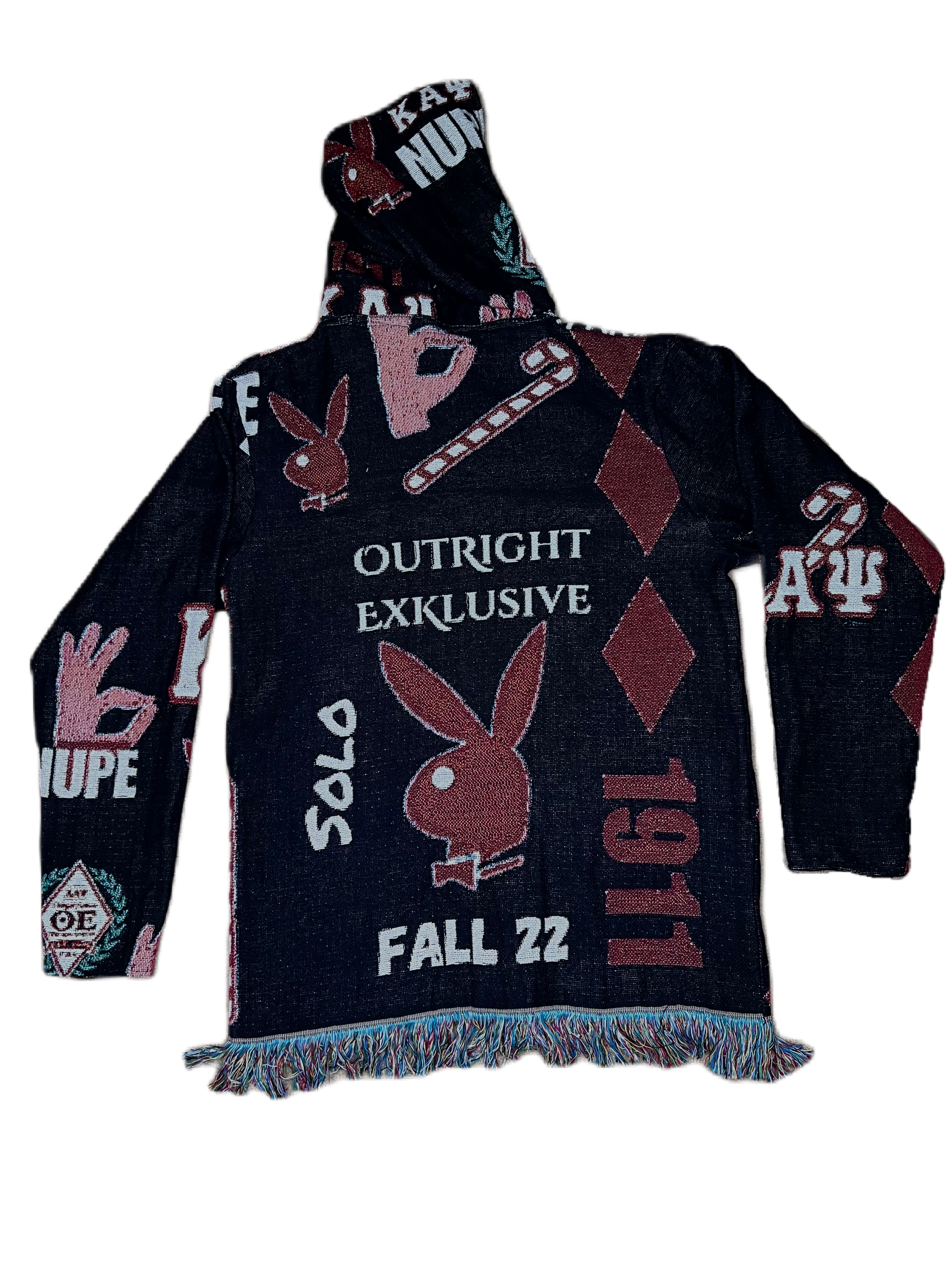 ex : blue , drake album cover , sweater with fringes on the sleeve holes